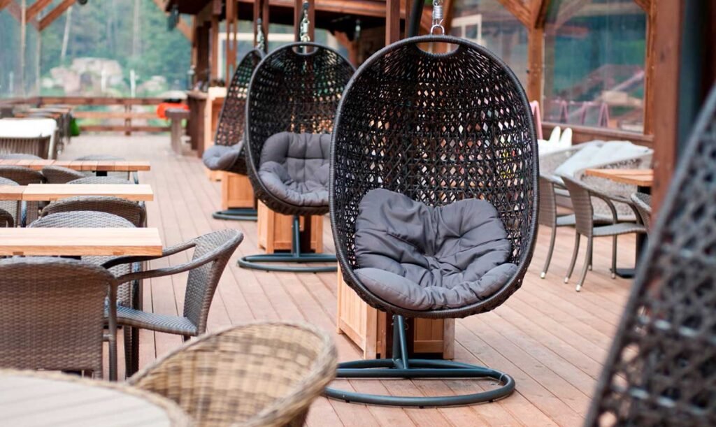 На вулиці кресло коконн виглядає особливо гармонійно. Його можна встановити на терасі, у саду або біля басейну. Завдяки спеціальним матеріалам такі моделі витримують сонце, дощ і вітер.