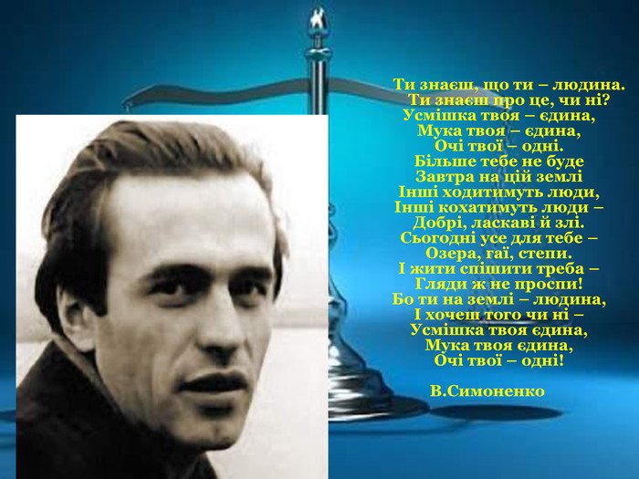 Ти знаєш що ти людина – рядок, який належить українському поету Василю Симоненку. Він жив у часи, коли свобода слова була обмежена, проте його вірші надихали людей відчувати власну гідність і не втрачати віри в себе. Ця фраза з’явилася як нагадування кожному, що навіть у важкі періоди варто залишатися Людиною.